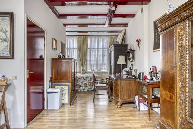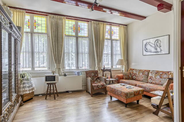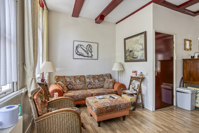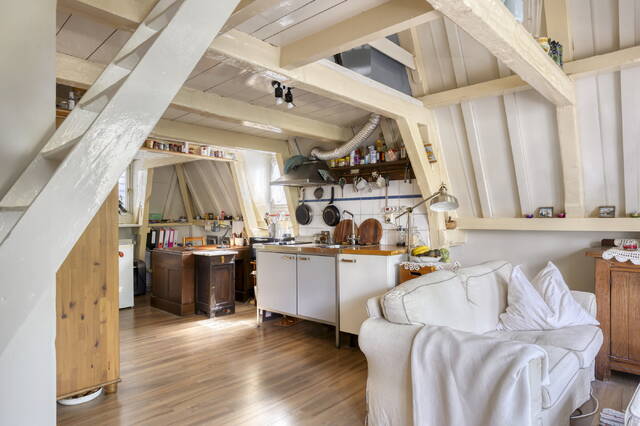 Een waar hoogtepunt van deze woning is de 2e verdieping, waar zich nog een ruime woonlaag met vide bevindt. De woonkamer heeft een open karakter, wordt van veel daglicht voorzien en heeft een hoog plafond. Ook hier geven de houten draagbalken een uniek gevoel aan de ruimte.