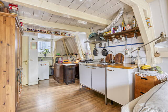 De aangrenzende keuken beschikt over een klein kookstel met inductiekookplaat, spoelbak en biedt plek voor een losstaande koelkast. Desgewenst kan de keuken gemoderniseerd worden om aan uw woonwensen te voldoen.