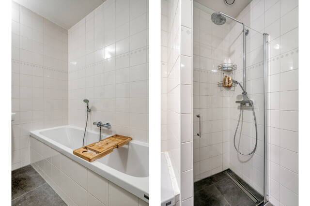 The bathroom is spacious and neatly finished. Its practical layout, calm appearance and comfortable dimensions create a functional space where you can start and end your day with ease.