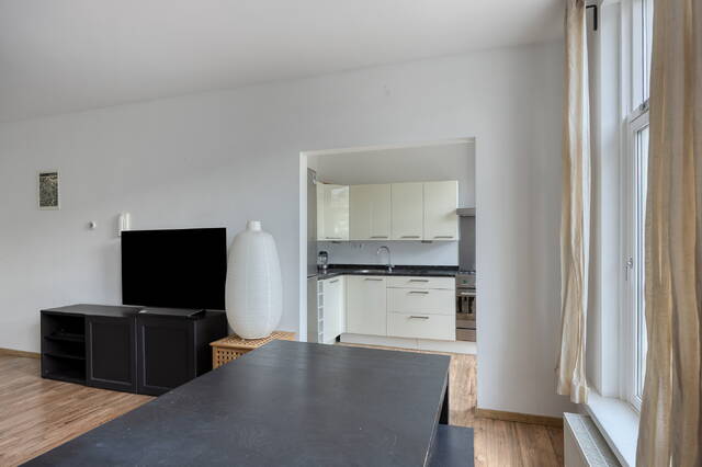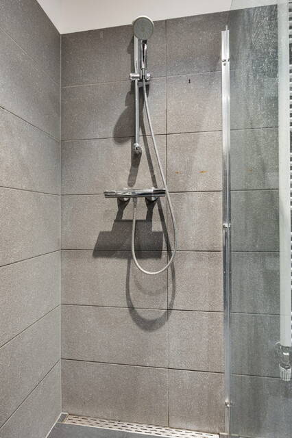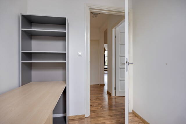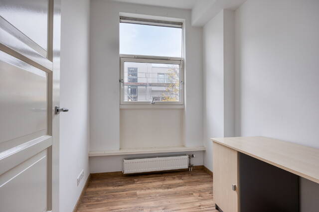 The luxurious bathroom features a bathtub, walk-in shower, and washbasin — a high-quality finish that provides comfort on a daily basis. The main bedroom is spacious and quietly located, while the second room is ideal as a guest room or home office.