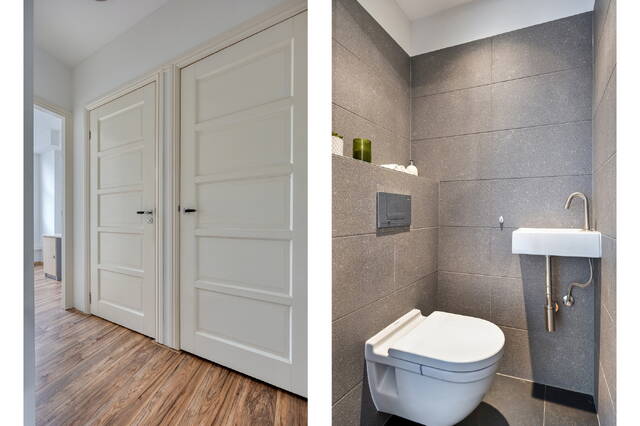De luxe badkamer beschikt over een ligbad, inloopdouche en wastafel — een hoogwaardige afwerking die zorgt voor dagelijks comfort. De hoofdslaapkamer is ruim en rustig gelegen; de tweede kamer is ideaal als logeer- of werkkamer.