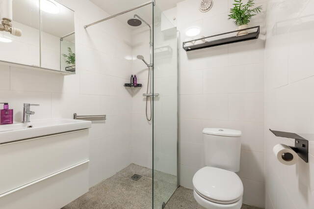 The spacious bedroom also provides access to the west-facing balcony — ideal for enjoying the evening sun after work. The bathroom features a generous walk-in shower, washbasin, and toilet.