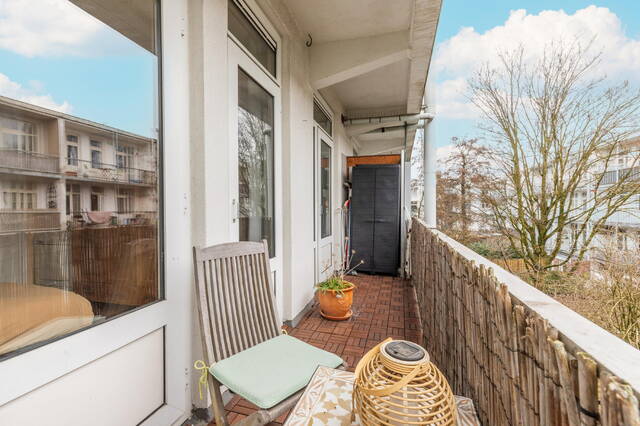 Het appartement is gelegen op de tweede verdieping en is praktisch ingedeeld. Via de hal heb je toegang tot alle ruimtes. De lichte woonkamer met eikenhouten vloer heeft grote ramen die zorgen voor een prettige, open sfeer. De keuken grenst direct aan het balkon en is een topplek voor je ochtendkoffie of om lekker van de zon te genieten. De keuken is voorzien van alle benodigde apparatuur, waaronder een kokendwaterkraan.