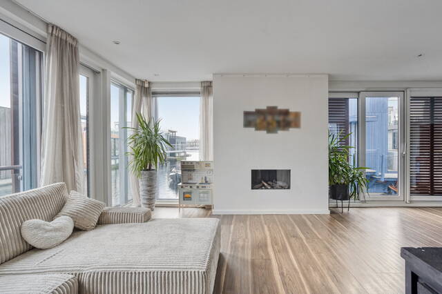De woonkamer is licht, ruim en voorzien van een gashaard, terwijl het vrije uitzicht over het water zorgt voor rust en ruimte. Dankzij de buitenpanelen kun je de zoninval en privacy naar wens regelen; comfortabel in elk seizoen.