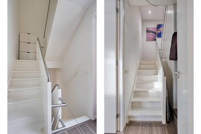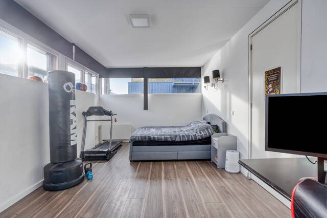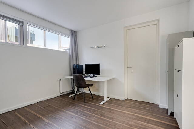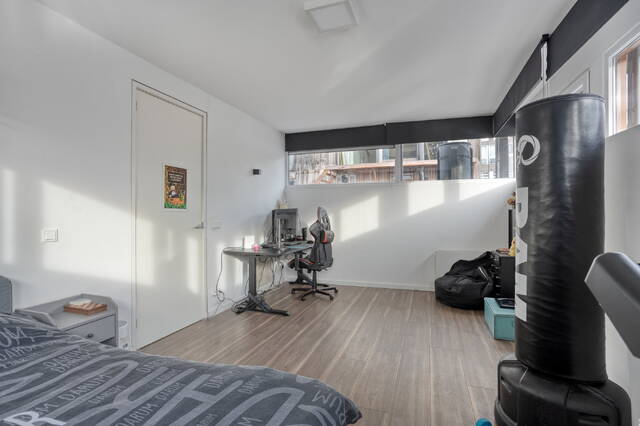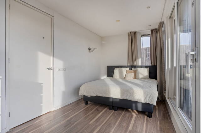 Op de bovenste woonlaag vind je een royale slaapkamer die direct grenst aan het riante dakterras: een plek voor koffie in de ochtendzon, een boek in de middag en een glas wijn bij zonsondergang. Daarnaast is er een tweede badkamer met een ligbad met bubbelbadfunctie, wastafel en toilet. Een fijne, rustige verdieping met een luxe hotelsfeer.