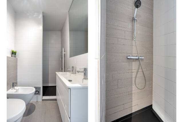 The bathroom on this level is luxuriously finished and equipped with a walk-in shower, bidet and double washbasin, offering both practicality and comfort.