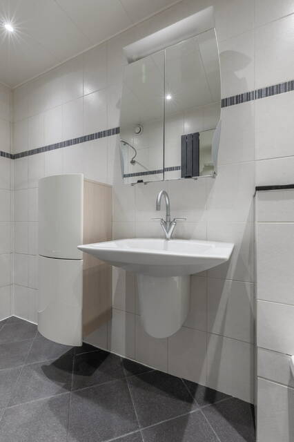 The living room is spacious and bright, with French doors opening onto the courtyard garden, creating a natural connection between indoor and outdoor living. The kitchen is located next to the living room and can easily be integrated into the living space. In the presentation, an optional floor plan is included in which the wall between the kitchen and the living room has been removed – an obvious renovation that would create a spacious and modern open kitchen.
