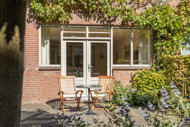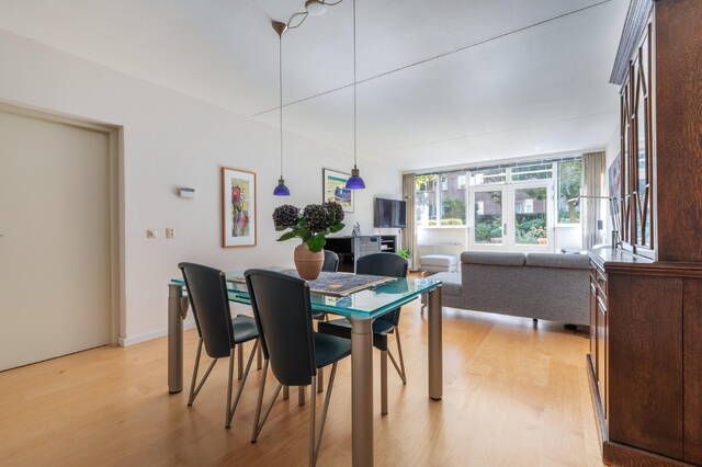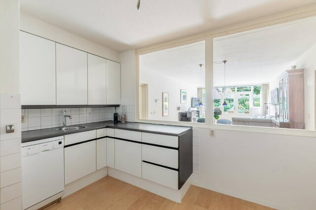 De woonkamer is ruim en licht, met openslaande deuren naar de binnentuin waardoor binnen en buiten op een natuurlijke manier in elkaar overlopen. De keuken bevindt zich naast de woonkamer en kan relatief eenvoudig bij de leefruimte worden betrokken. In de presentatie is een optionele plattegrond opgenomen waarin de muur tussen keuken en woonkamer is verwijderd – een voor de hand liggende aanpassing waarmee een ruime, moderne open keuken kan worden gecreëerd.