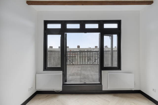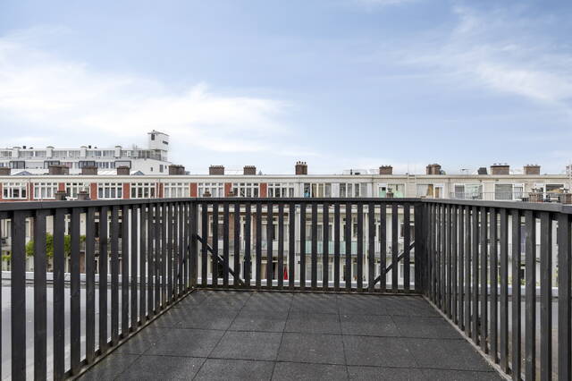 Through the French doors from the living room you step directly onto the rooftop terrace, twelve point two square metres with a west-facing orientation. That means full evening sun, right at the moment you are home after a long day. In summer this is the place for a barbecue with friends, or simply winding down with a book as the sun sets around you. The sounds of the city fade here, and you get the feeling of being completely away from it all, right in the middle of Amsterdam.