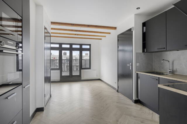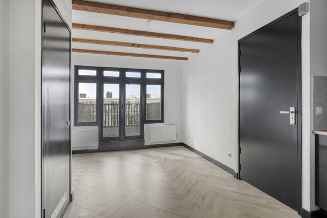 Stepping inside, what immediately strikes you is how cleverly the 33.1 m2 has been used. The studio was fully renovated in 2021, and it shows in every detail. Fresh finishes, modern materials and a layout that feels twice as spacious. The open-plan kitchen flows seamlessly into the living area, and the west-facing French doors let daylight pour in throughout the day. The kitchen itself is a pleasure to cook in: induction hob, oven, microwave, fridge-freezer combination and a generous pantry cupboard for all your supplies.