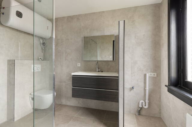 The bathroom is fully and practically fitted out. You will find a walk-in shower, a toilet, a generous washbasin with illuminated mirror and space for both a washing machine and a dryer. Everything you need, arranged in a clean and practical way.