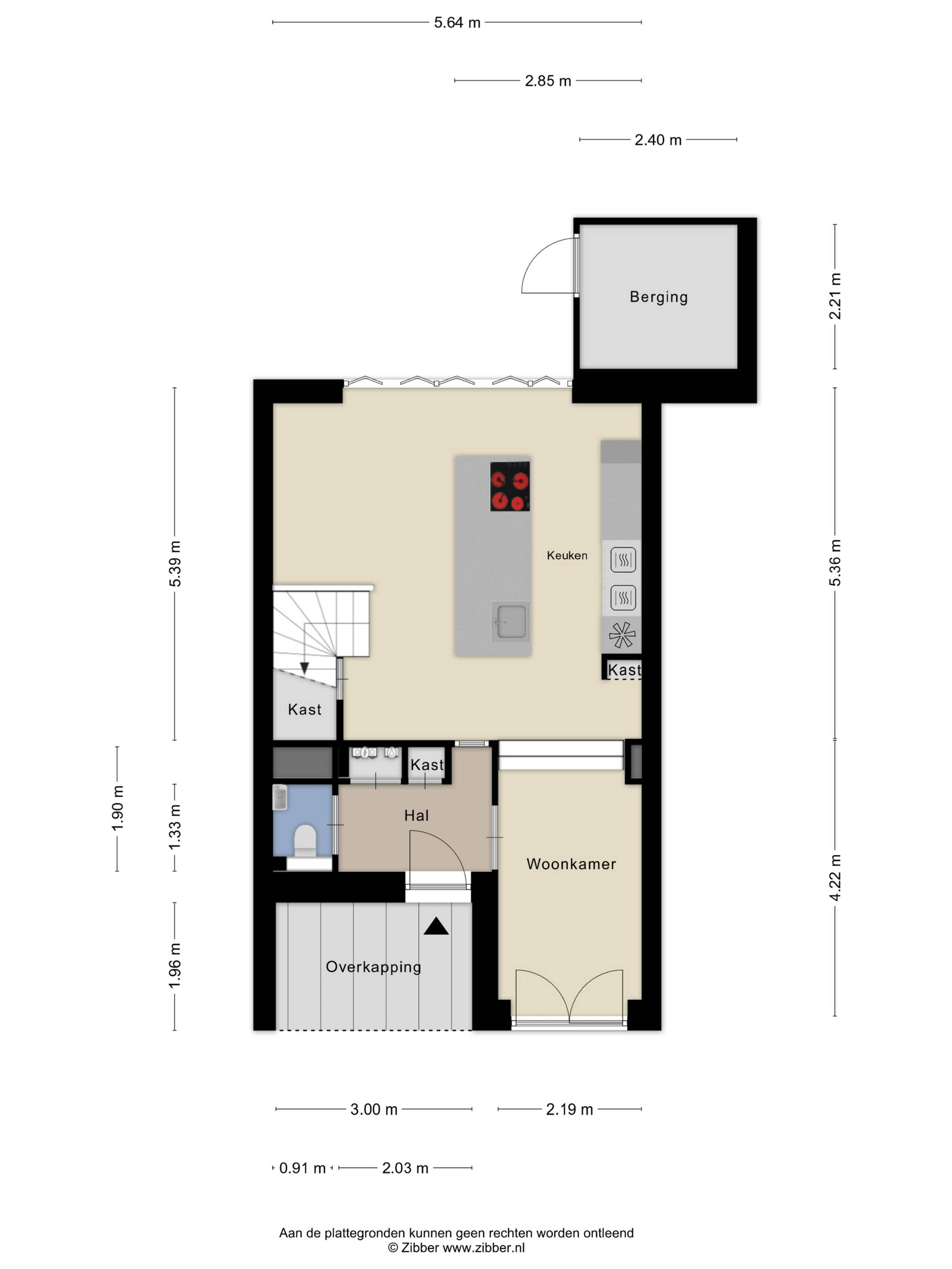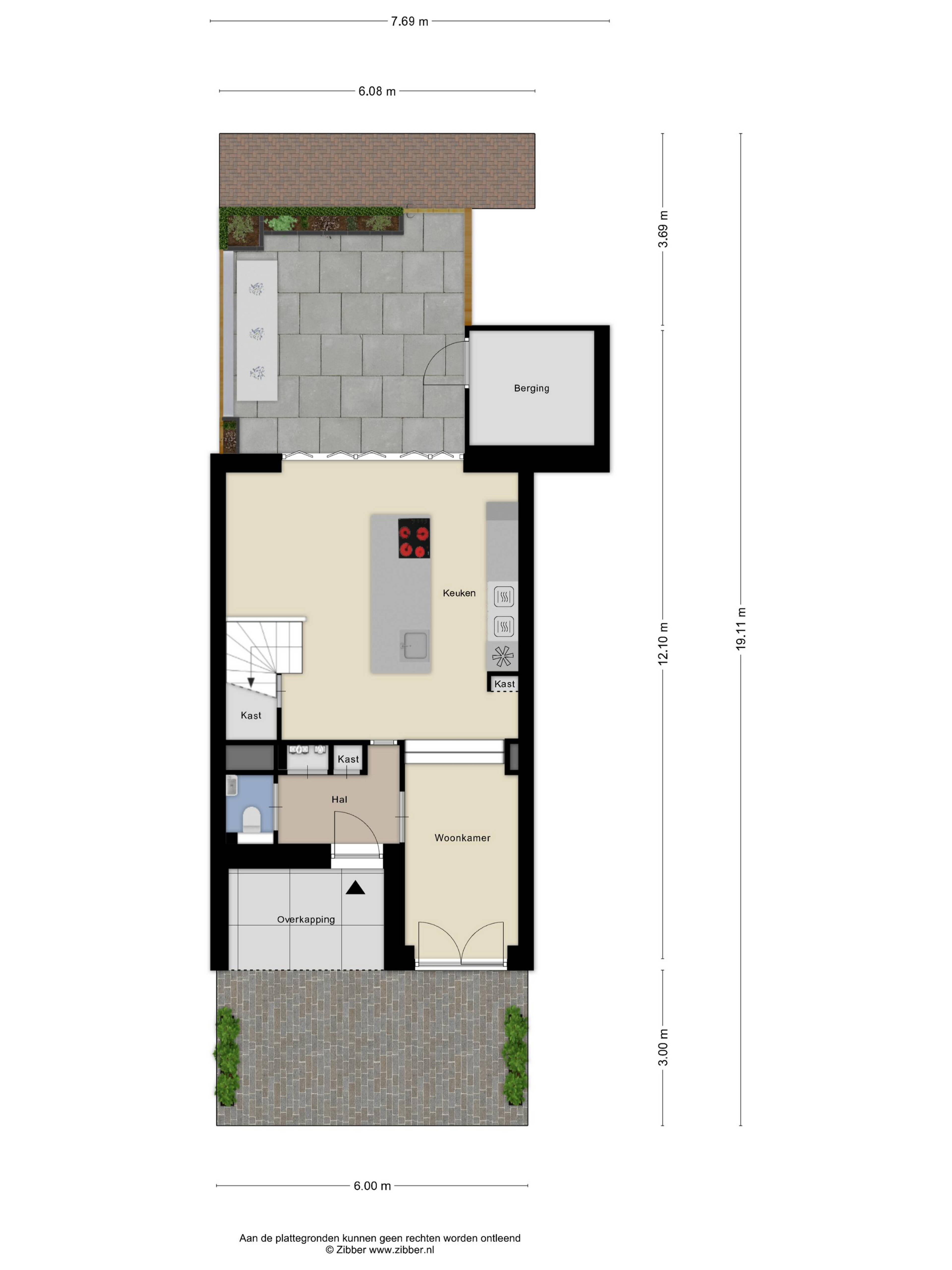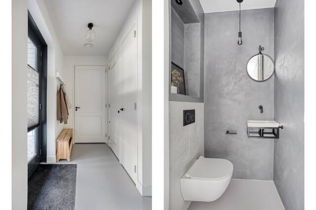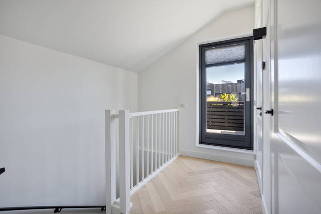 De woning betreed je via een ruime entreehal met separaat toilet en kastenwand. Maar het is de achterzijde die meteen de toon zet. De keuken is hoog afgewerkt met een centraal kookeiland en goede inbouwapparatuur, en dankzij de harmoniaschuifpui over de volle breedte verdwijnt de grens tussen binnen en buiten op het moment dat het er toe doet. De tuin van circa 20 m² ligt op het oosten — ideaal voor een rustig ontbijt in de ochtendzon. Vanuit de tuin is de berging direct toegankelijk. De gietvloer op de begane grond geeft het geheel een strakke, samenhangende uitstraling. Aan de voorzijde is een extra kamer aanwezig die goed dienst doet als speelkamer, hobbyruimte of kantoor aan huis. Een overkapping bij de voordeur rondt de entree netjes af.