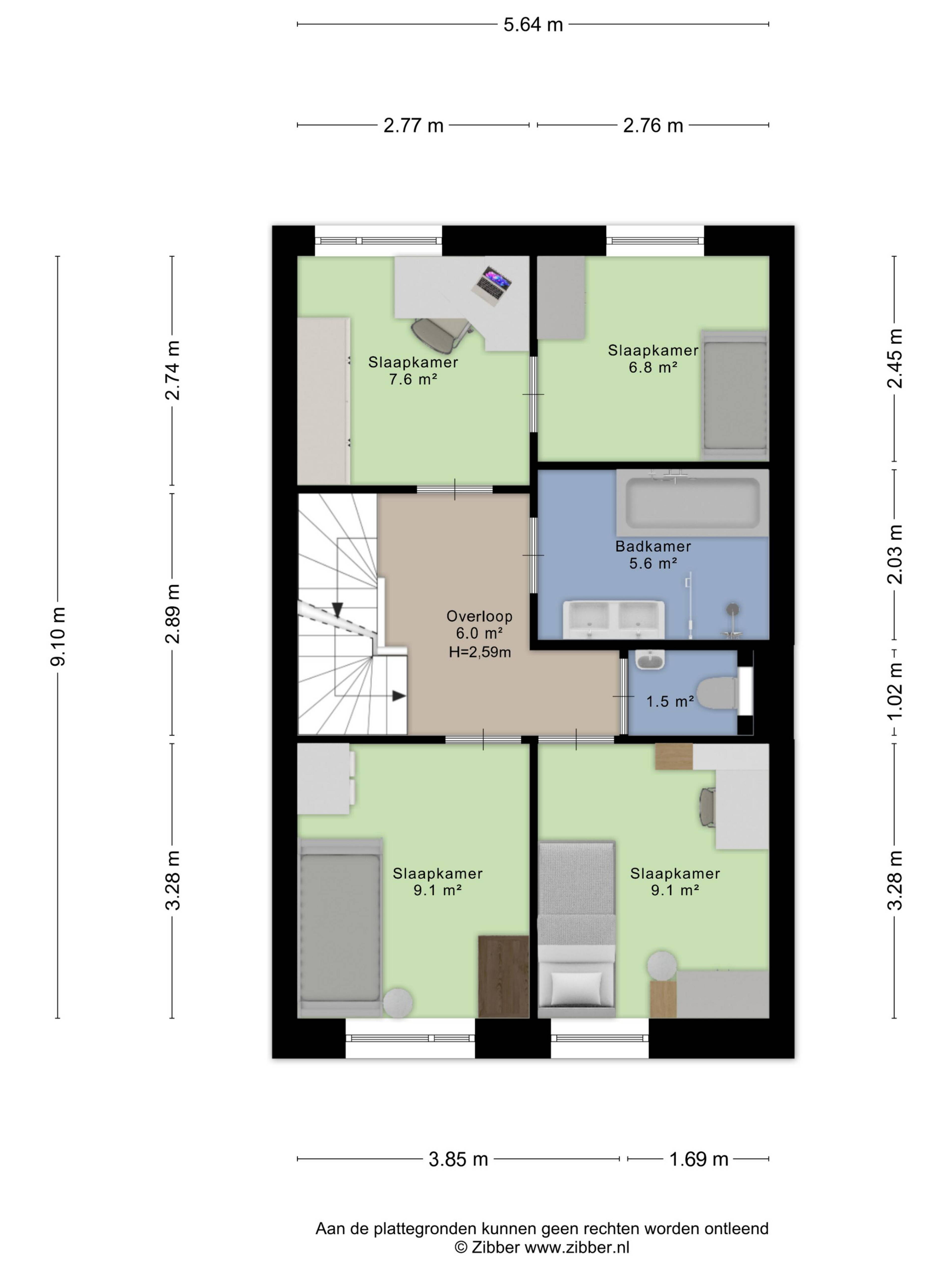 The second floor houses four bedrooms, well distributed across the width of the home. At the front, two rooms of 7.6 m² and 6.8 m² respectively; at the quieter rear, two equal rooms of 9.1 m² each. The central landing of 6 m² has a ceiling height of 2.59 metres, giving the floor a spacious feel. The bathroom is finished to a good standard and features a bath, shower and washbasin. A separate toilet completes the floor.
