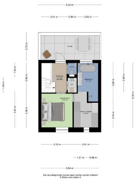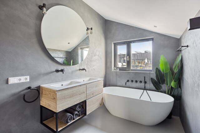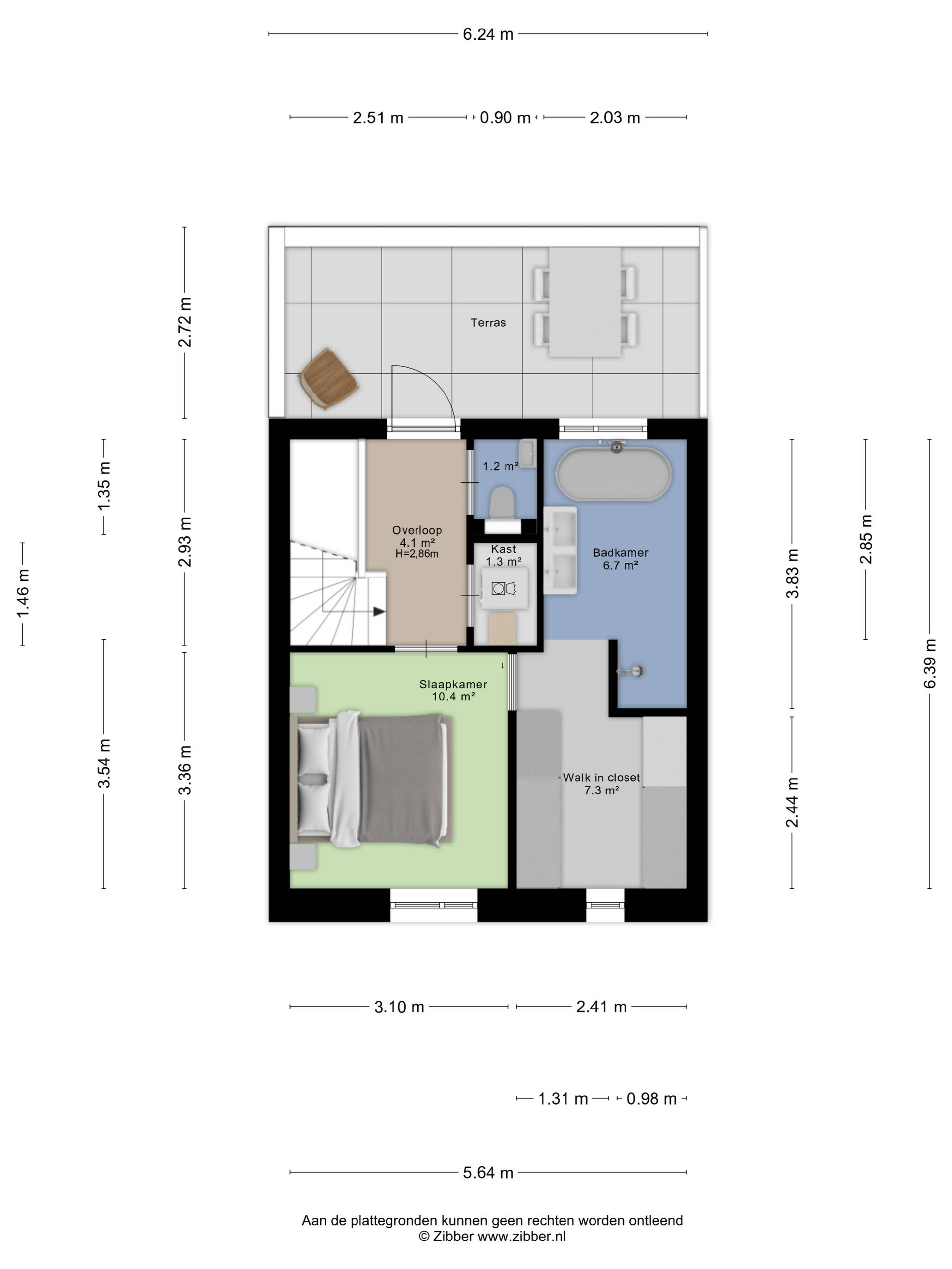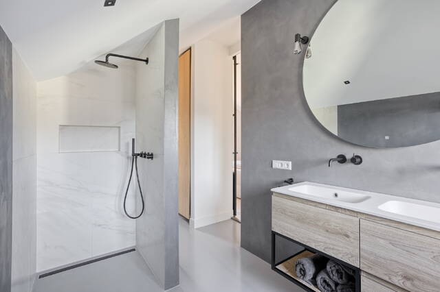 De bovenste verdieping is volledig ingericht als een op zichzelf staande mastersuite. De slaapkamer van 10,4 m² heeft directe toegang tot een eigen badkamer van 6,7 m², afgewerkt met hoogwaardige materialen, en een walk-in closet van 7,3 m² die meer dan genoeg ruimte biedt. Via de overloop — plafondhoogte 2,86 meter — kom je op het eigen terras aan de achterzijde. Wat je daar aantreft, is een uitzicht over het IJ dat je bij elke stand van het licht opnieuw verrast. Een plek die de dag goed begint en beter eindigt.