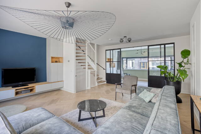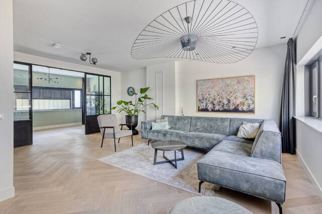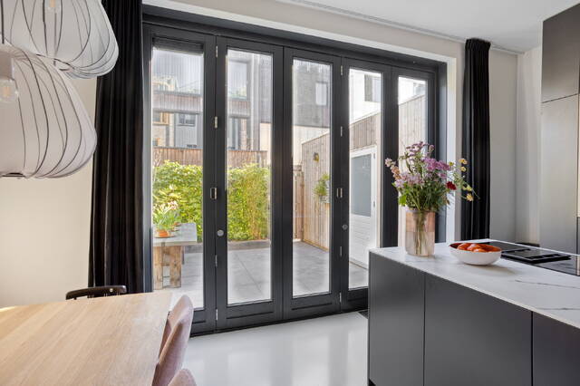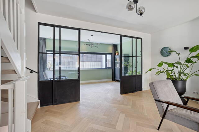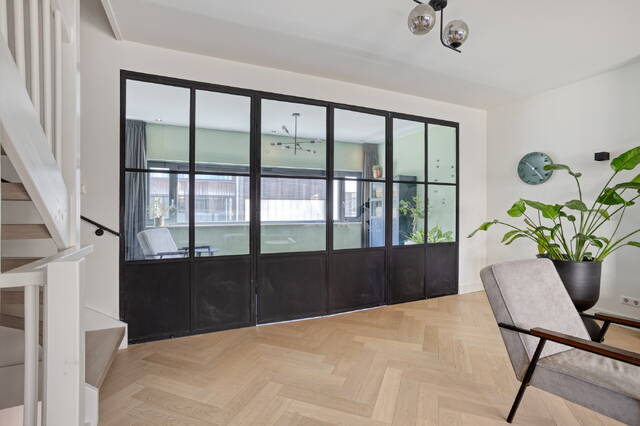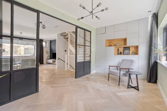 Step onto the first floor and you immediately understand what makes this home stand out. The living room measures 34.9 m² with a ceiling height of 2.64 metres. Large windows at both the front and rear fill the space with light and create an open, airy atmosphere. There is plenty of room for a generous seating area and additional space to arrange as you see fit. An adjoining separate room of 13.8 m² works perfectly as a study, practice room or children’s playroom. Steel-framed doors connect the spaces and give the floor a contemporary character that sits in perfect harmony with the home’s careful finishing throughout.