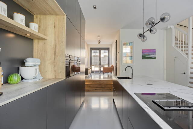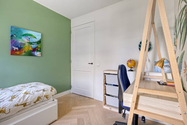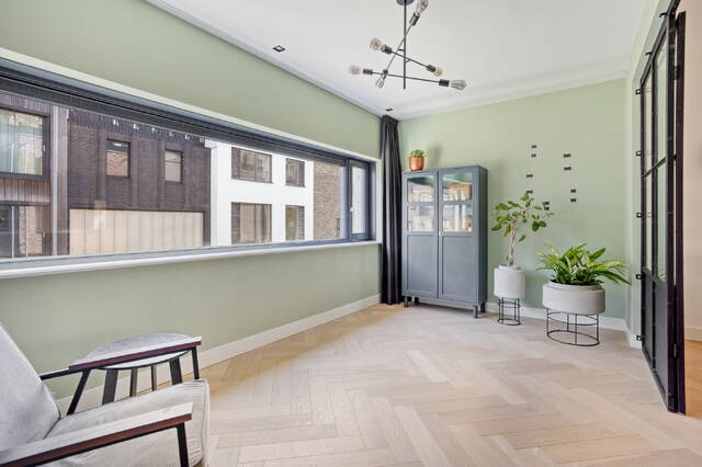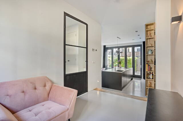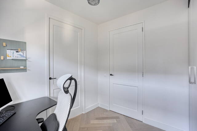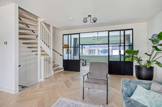 Wie de trap op loopt naar de eerste verdieping, begrijpt meteen wat deze woning bijzonder maakt. De woonkamer meet 34,9 m² en heeft een vrije plafondhoogte van 2,64 meter. Twee grote raampartijen aan voor- en achterzijde zorgen voor een uitstekende lichtinval en een prettig open woonklimaat. Er is ruimschoots plek voor een grote zithoek en nog eens extra ruimte die je naar eigen inzicht invult. Aangrenzend bevindt zich een separate kamer van 13,8 m², die uitstekend dienst doet als werkkamer, praktijkruimte of speelkamer voor de kinderen. Stalen deuren verbinden de vertrekken en geven de verdieping een eigentijdse uitstraling die naadloos aansluit bij de verzorgde afwerking van de woning.