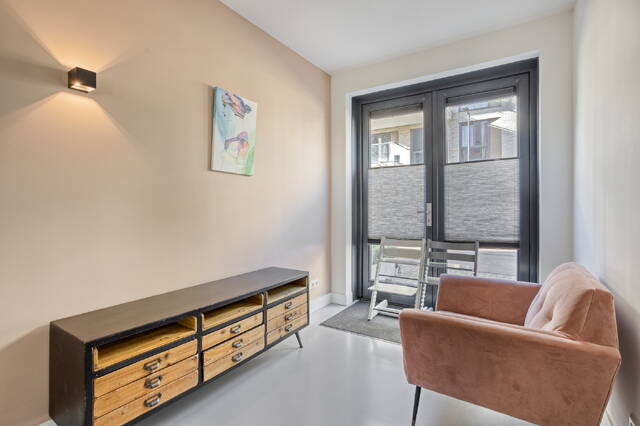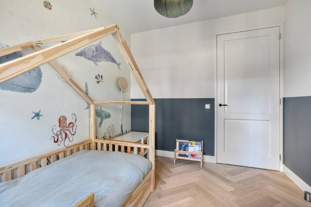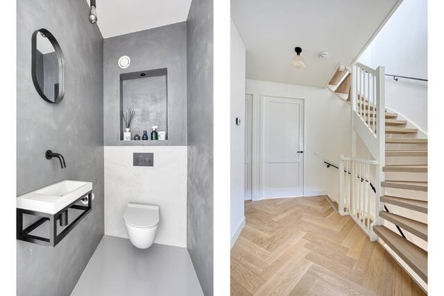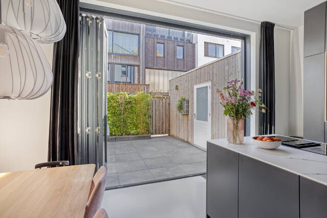 You enter the home through a spacious hallway with a separate toilet and practical storage. But it is the rear of the ground floor that sets the tone immediately. The kitchen is finished to a high standard with a central kitchen island and quality built-in appliances — and thanks to the full-width bi-fold sliding doors, the boundary between inside and out simply disappears when it matters most. The garden of approximately 20 m² faces east, perfect for a quiet breakfast in the morning sun. The storage room is directly accessible from the garden. A polished concrete floor throughout the ground floor ties the whole space together. At the front, an additional room works well as a playroom, hobby space or home office. A canopy at the front door completes the entrance neatly.