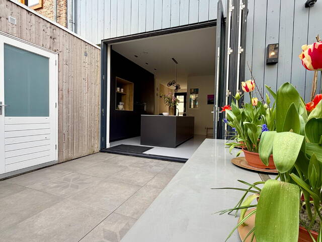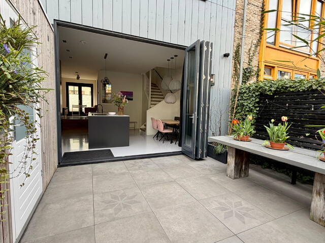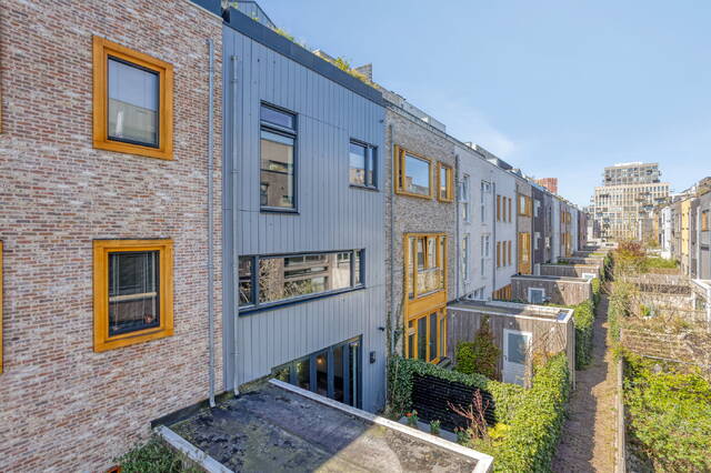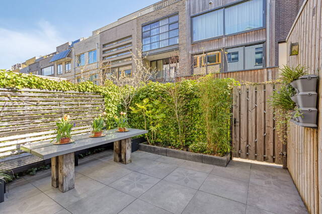 De achtertuin van circa 20 m² ligt op het oosten, is volledig betegeld en direct bruikbaar. Afgeschermd en onderhoudsarm — precies zoals het hoort bij een woning die al zoveel binnen biedt. Het terras op de derde verdieping voegt daar nog een heel andere dimensie aan toe.