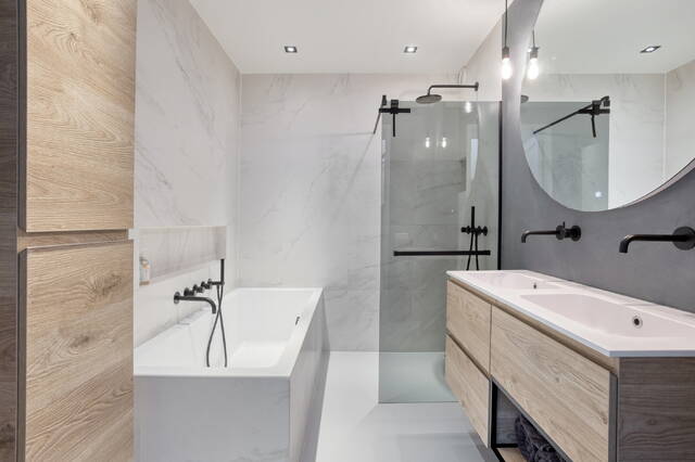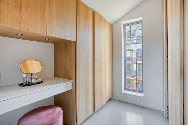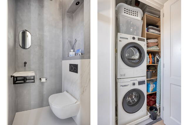 The top floor is entirely arranged as a self-contained master suite. The bedroom of 10.4 m² has direct access to its own bathroom of 6.7 m², finished with quality materials, and a walk-in wardrobe of 7.3 m² that offers more than enough space. Via the landing — ceiling height 2.86 metres — you step out onto the private terrace at the rear. What you find there is a sweeping, unobstructed view over the IJ, one that catches you differently at every hour of the day. A place that starts the morning well and ends it better.