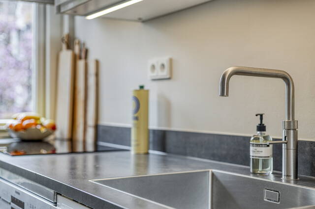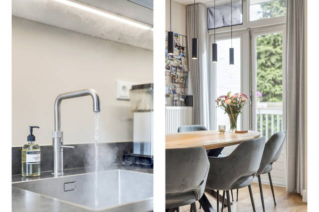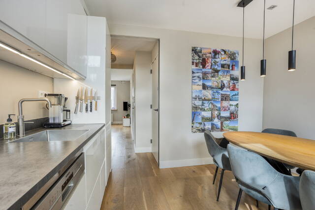 Een eigen karakter heeft dit appartement zeker, maar de leefkeuken is misschien wel het meest onderscheidende element. Hier is niet alleen plek voor een serieuze keukenopstelling, maar ook voor een eettafel waar je met vrienden aan kunt aanzitten voor een lange avond met goed eten en nog beter gezelschap. De keuken is volledig vernieuwd in 2021 en voorzien van moderne apparatuur en een praktische indeling. Via de keuken stap je direct het balkon op, zodat die eerste ochtendkoffie in de buitenlucht nooit ver weg is.