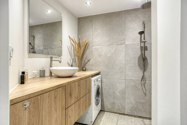 The bedroom comfortably accommodates a double bed with wardrobe storage. Adjacent to it you will find the fully renovated bathroom, equipped with everything that makes your daily routine a pleasure. The finish is crisp, the tones are timeless and the space feels fresh and clean.