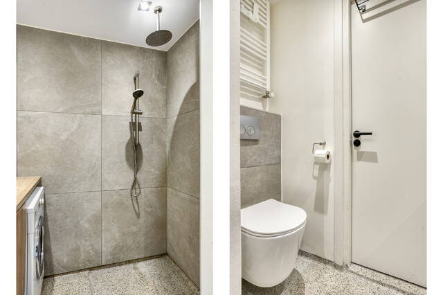 De slaapkamer biedt comfortabel ruimte voor een tweepersoonsbed met kledingopberging. Aangrenzend vind je de volledig gerenoveerde badkamer, voorzien van alles wat je dagelijkse routine aangenaam maakt. De afwerking is strak, de kleuren zijn tijdloos en de ruimte voelt fris en schoon aan.