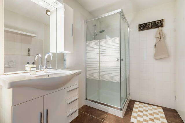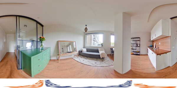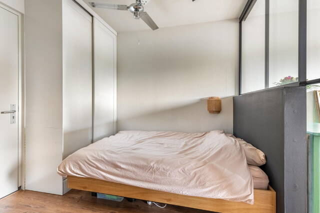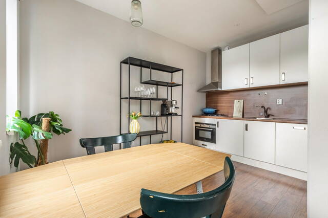 Via de nette entree loop je naar de tweede verdieping. Je komt binnen via de slaapkamer; rechts vind je de badkamer. Dankzij de glazen tussendeur opent de woning zich naar een lichte woon-keuken: een prettige ruimte met een moderne keuken vol inbouwapparatuur en genoeg werk- en opbergruimte.