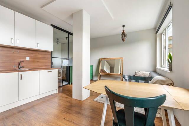 Via the neat entrance you reach the second floor. You enter through the bedroom; to the right is the bathroom. A glass interior door opens into a light-filled living room and kitchen; a pleasant space with a modern kitchen fitted with built-in appliances and plenty of counter and storage space.
