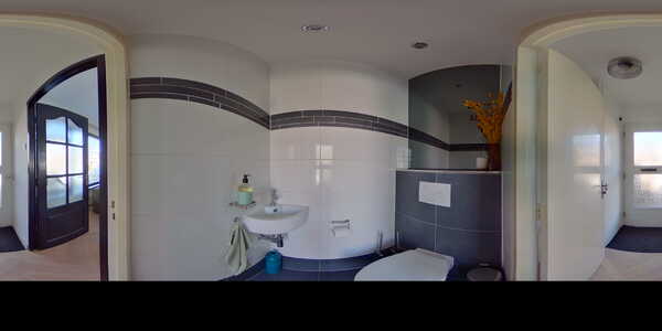 The second floor can be reached via the stairs in the living room. Here you will find two bedrooms and the bathroom. The bathroom is perfectly maintained and has a modern and luxurious look with large beige tiles and a wooden washbasin with double sink. Here you can relax with fine bath, walk-in shower and toilet.