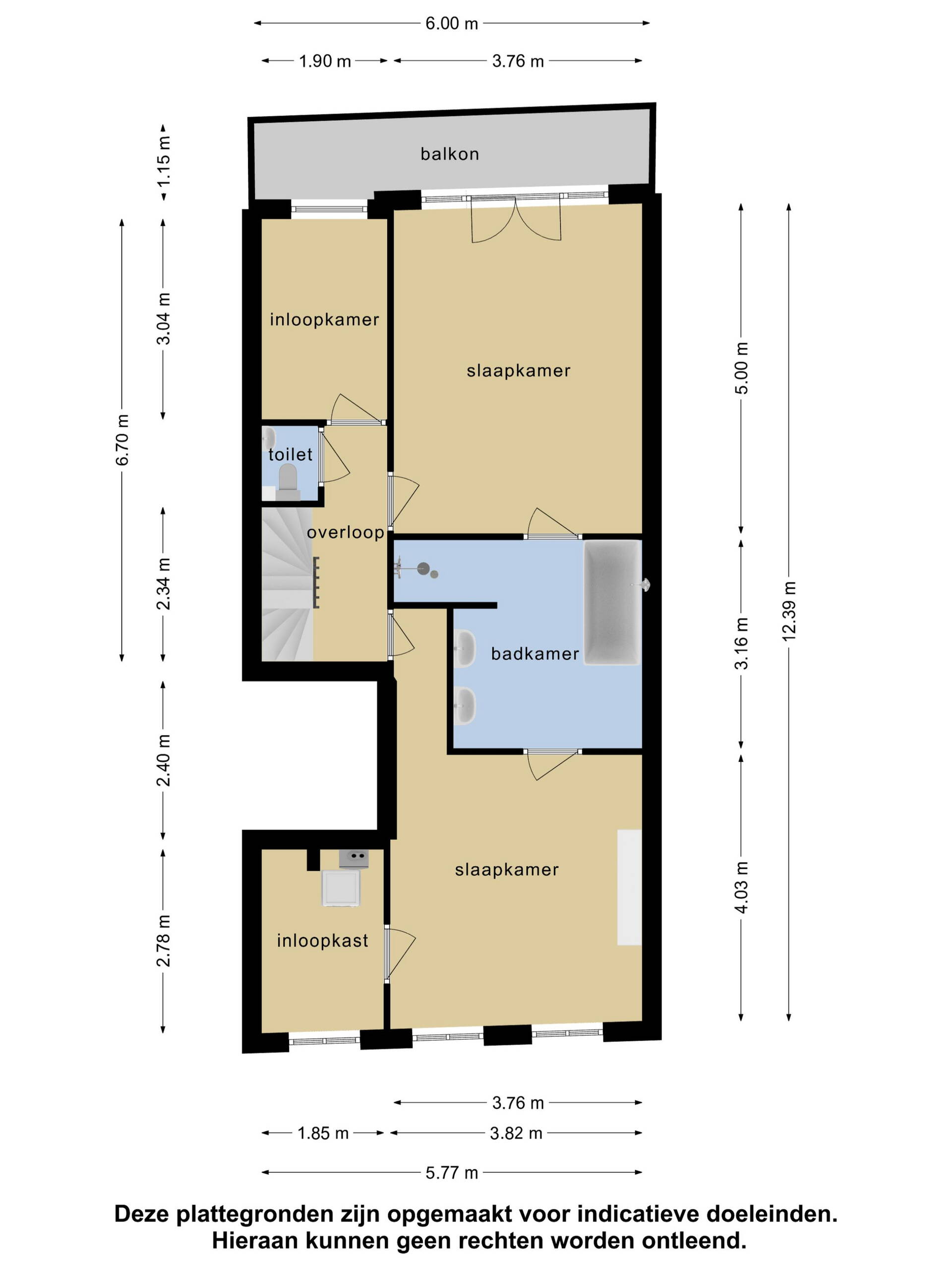 De vaste trap leidt je naar een knusse overloop die net als de aangrenzende kamers is bekleed met een laagpolig blauw tapijt. Hieraan grenzen behalve de trap een toilet, een inloopkast en een tweetal riante slaapkamers.