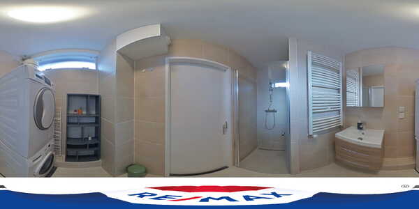 The stylish bathroom features light wall and floor tiles, a walk-in shower, washbasin in furniture, washing machine connection and a dryer connection.
